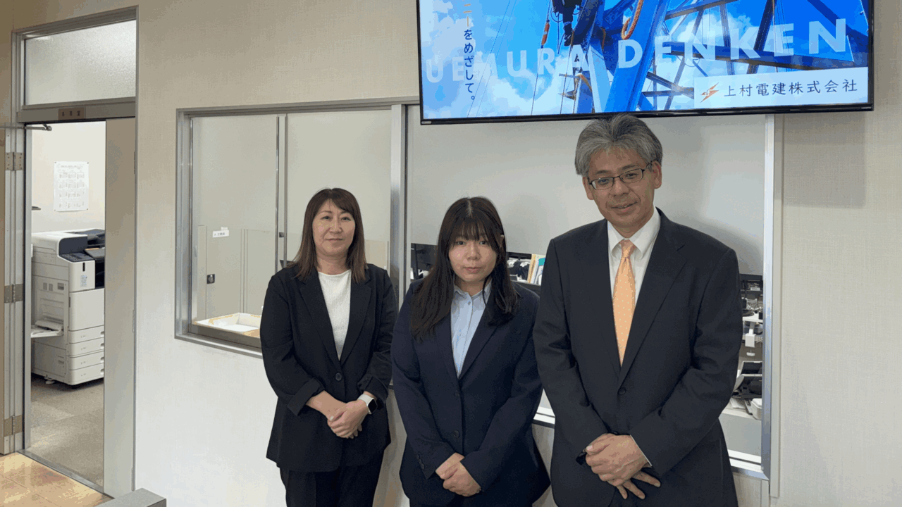 上村電建株式会社総務部長 藤井隆幸様総務部主任 小堀千尋様総務部 角優衣様 認知度向上と若手...
